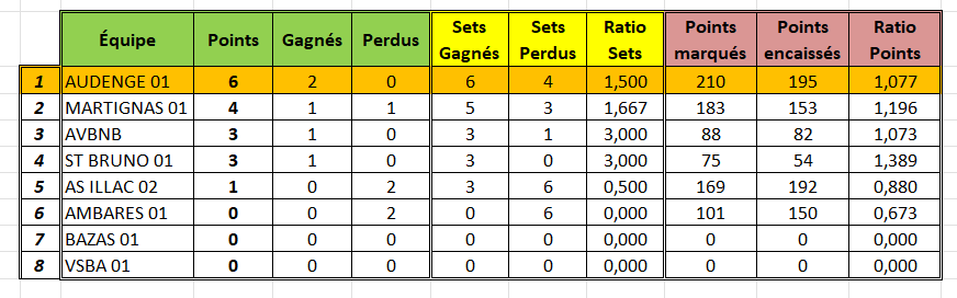 Grâce à cette victoire, et après cette 2ᵉ journée de championnat, B&VA 1 prend la tête du classement.